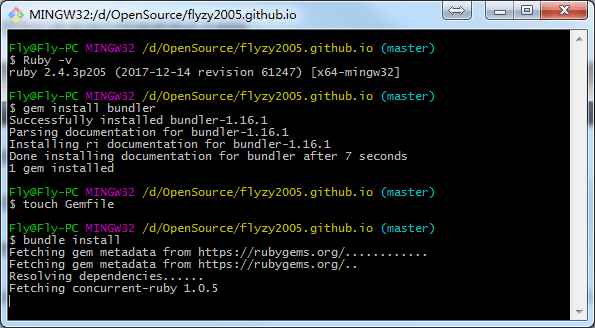 安装Jekyll之前要先去安装ruby,有Windows版的rubyinstall,下载地址:ruby Windows版本下载 我下载了个最新版的2.5.0-1,结果进行下面步骤的时候提示:Gem::RuntimeRequirementNotMetError: ffi requires Ruby version < 2.5, >= 2.0. The current ruby version is 2.5.0. An error occurred while installing ffi (1.9.18), and Bundler cannot continue. Make sure that `gem install ffi -v ‘1.9.18’` succeeds before bundling. 后来就换成了2.4.3的了~